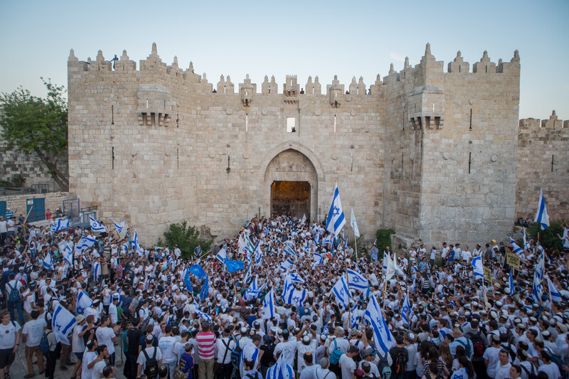 Israeli youth rally outside the Old City of Jerusalem during the Jerusalem Day march organized by Israeli nationalists and which celebrates 48 years of Israeli occupation of East Jerusalem, 17 May.