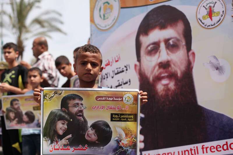 Palestinians in Gaza City hold posters of Khader Adnan, the prisoner movement leader on open-ended hunger strike to protest his detention by Israel without charge or trial, 24 May.