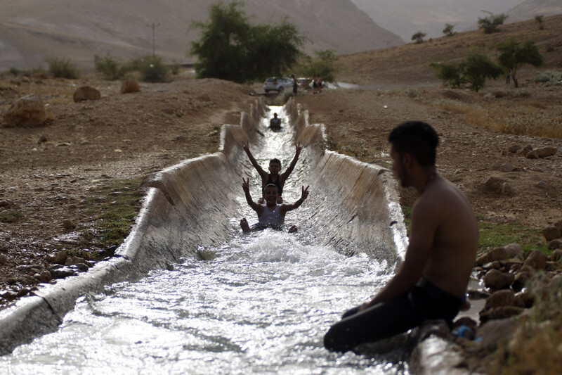 Palestinian youths slide down a water canal used for irrigation as temperatures soared in the West Bank city of Jericho on 27 May.