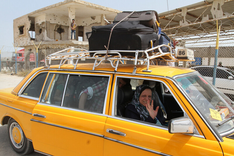 A Palestinian woman waves upon her return to Gaza via the Rafah crossing between Egypt and southern Gaza on 27 May. Egyptian authorities opened the crossing for the first time in nearly 80 days to allow stranded Palestinians to return to Gaza. But Palestinians waiting to leave Gaza, including patients seeking medical treatment, were not able to travel to Egypt.