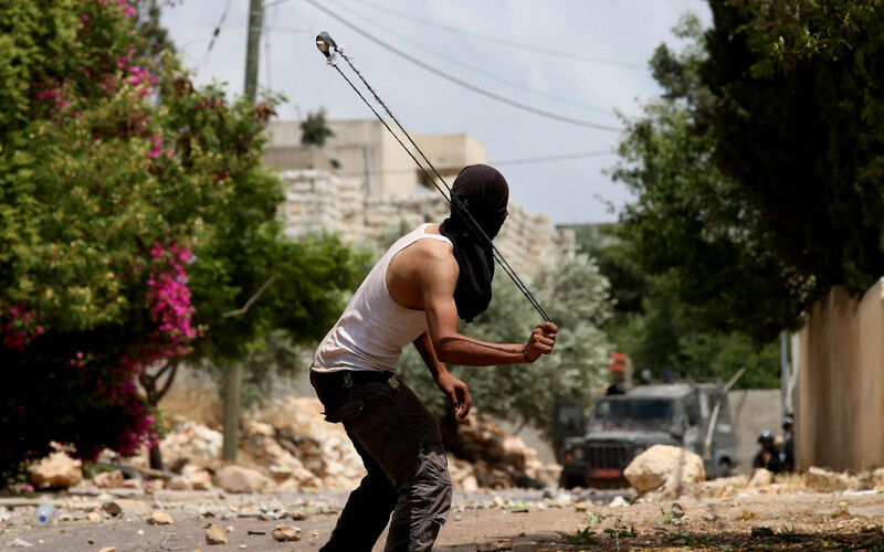 A Palestinian protester throws stones at Israeli forces during clashes following a demonstration against the expropriation of Palestinian land in the West Bank village of Kufr Qaddum, near Nablus, on 29 May.