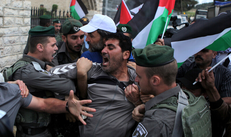 Israeli forces try to detain a Palestinian protester during a demonstration outside a large church compound near al-Aroub Palestinian refugee camp, just north the West Bank city of Hebron, on 30 May. Palestinians were protesting the sale of the building to Israeli settlers via front groups.