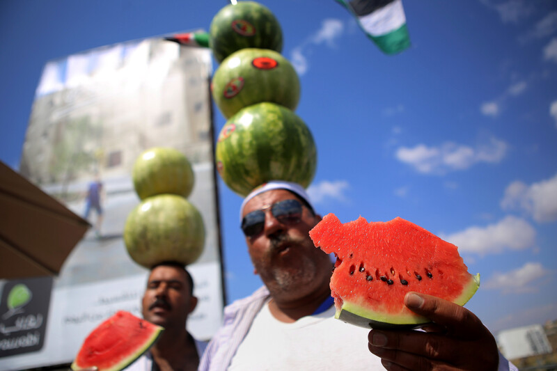 Palestinian fruit vendor Abu Haloom from Balata refugee camp balances watermelons on his head to attract customers along a road between Nablus and Ramallah in the West Bank, 30 May.