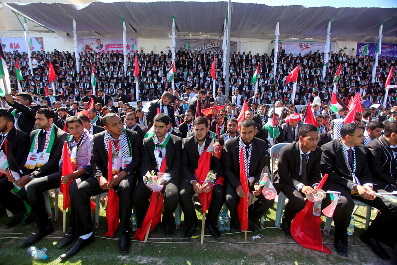 Palestinian grooms take part in a mass wedding in Gaza City on 31 May. Nearly 2,000 Palestinian couples were married in a ceremony funded by the Turkish government and supported by the Hamas movement.