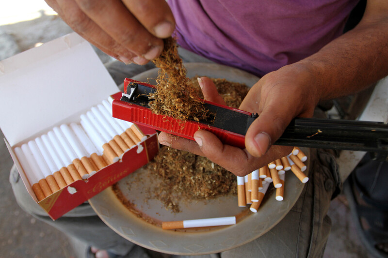 A Palestinian street vendor sells cigarettes rolled with local tobacco in the southern Gaza Strip city of Rafah on 31 May. The Gaza government increased taxes on cigarettes smuggled from Egypt and Israel to alleviate the financial crisis.