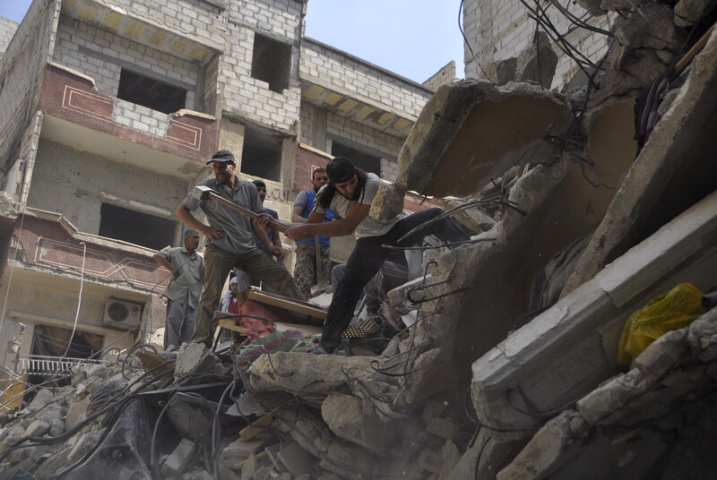 Men search for survivors amid the rubble at a site which activists said was hit by barrel bombs launched by forces loyal to Syrian President Bashar al-Assad, Yarmouk refugee camp, southern outskirts of Damascus, 26 May.