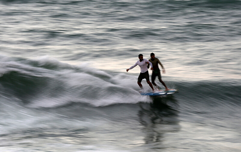 Palestinian men surf off the beach of Gaza City on 2 November.