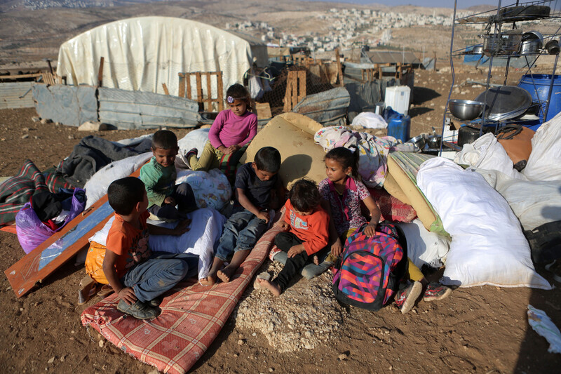 Palestinian Bedouin children sit on their belongings as Israeli forces confiscate shelters on the pretext they were built without a permit in the West Bank village of Jaba, near Jerusalem, on 15 November. Israel routinely denies Palestinians building permits and then destroys structures built without permission.