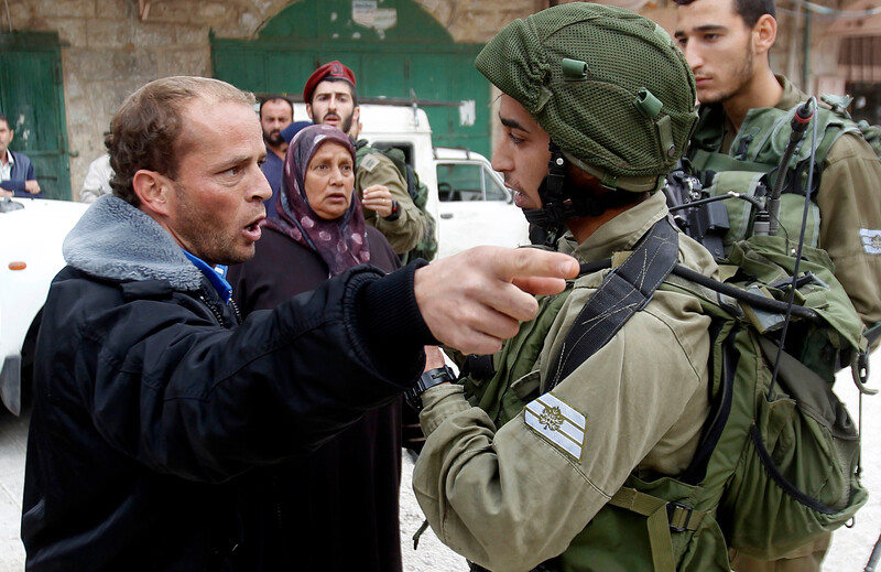 A Palestinian man confronts Israeli forces after they arrested two Palestinian youths, accusing them of throwing stones at soldiers, in the West Bank city of Hebron on 16 November.