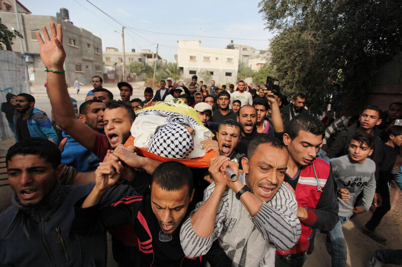 Mourners carry the body of Muhammad Abu Saada, a 26-year-old Palestinian who was shot dead by the Israeli army during a protest along Gaza’s eastern boundary, during his funeral in the Nuseirat refugee camp, central Gaza Strip, on 19 November.
