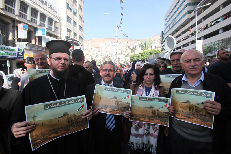 APA imagesPalestinians in the West Bank city of Nablus protest against an Israeli bill banning mosques from broadcasting the call to prayer, on 20 November. Israeli Prime Minister Benjamin Netanyahu said he backed the bill, which critics have called a threat to religious freedom.