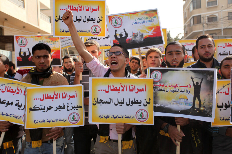 Palestinians show solidarity with Palestinians on hunger strike in Israeli prisons outside the Gaza City office of the United Nations High Commissioner for Human Rights on 22 November.