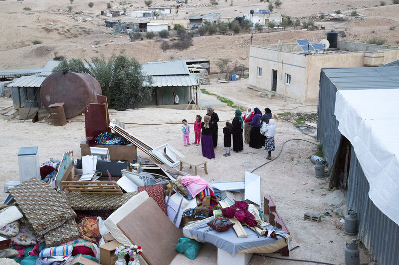 APA imagesResidents of the unrecognized Bedouin village of Umm al-Hiran stand next to their house after removing all of its contents ahead of an expected demolition in the Naqab desert region in the south of present-day Israel on 22 November. The Israel Land Authority announced the previous day that it would destroy the village, but the operation was delayed after a mobilization of protesters, including Palestinian members of Israel’s parliament, the Knesset, to prevent it.