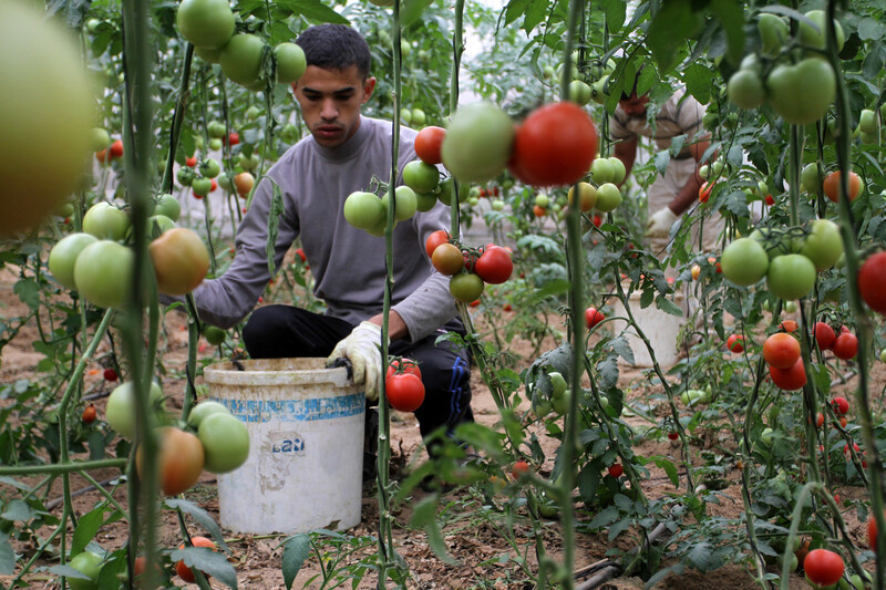 A Palestinian man picks tomatoes at a farm in Rafah, southern Gaza Strip, on 23 November.