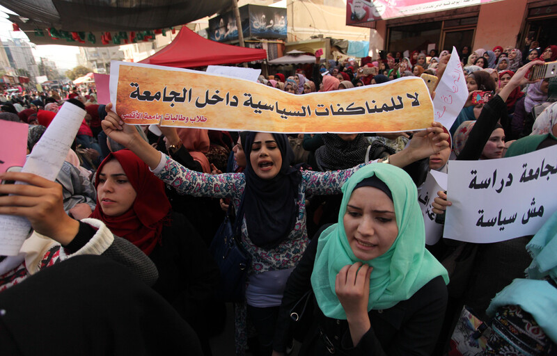 Palestinian students from the Al-Aqsa University protest in Gaza City on 28 November. The university and its more than 26,000 students have found themselves caught up in the political feud between the Fatah-led Palestinian Authority in the West Bank and Hamas, which governs Gaza. After freezing hiring and salaries, earlier this year the Ramallah government called on students not to register at Al-Aqsa because their degrees might not be accredited.