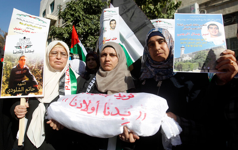 APA imagesPalestinians call on Israel to return the bodies of Palestinians slain during attacks or alleged attacks during a protest in the West Bank city of Hebron on 28 November.