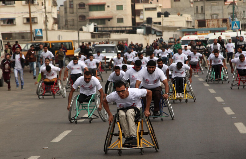 Palestinian men compete in a race in Gaza City organized for those wounded in Israeli wars on 29 November. Tens of thousands of Gaza residents are learning to cope with disability or lost limbs after the three successive assaults on Gaza between 2008 and 2014.