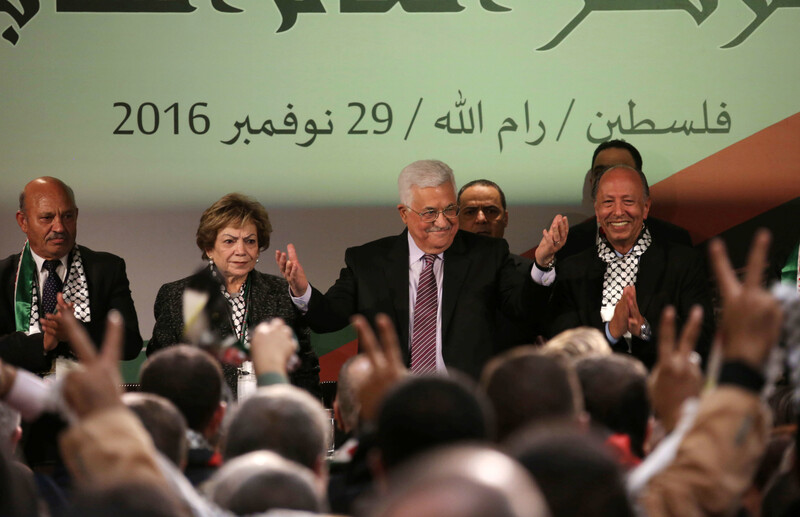 APA imagesPalestinian Authority leader Mahmoud Abbas gestures after delivering a speech on the second day of the Seventh Fatah Congress at the Muqataa, the PA headquarters, in the West Bank city of Ramallah on 30 November. Abbas addressed his party’s first congress since 2009 as he contends with internal dissent and grim prospects for realizing a Palestinian state.