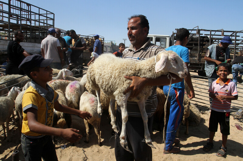 Palestinians buy sheep at a livestock market in Rafah, southern Gaza Strip, ahead of the Eid al-Adha holiday on 10 September.
