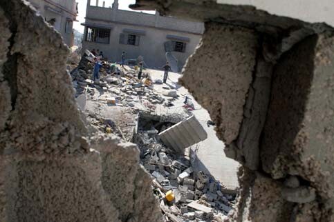 Palestinians inspect a demolished building after an Israeli air strike in Khan Younis in the southern Gaza Strip, in which two people were killed and four wounded, August 16, 2006. (MaanImages/Hatem Omar)