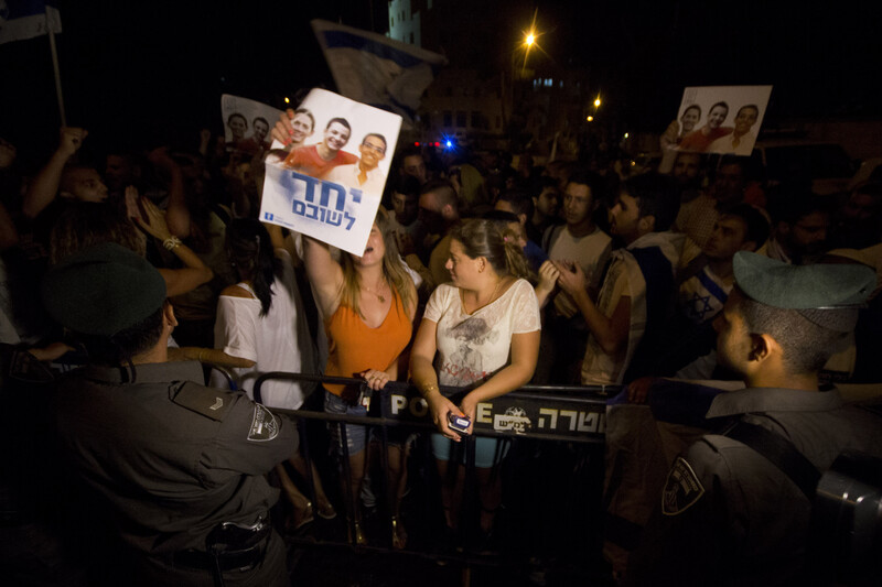 Right-wing protesters shout anti-Palestinian slogans during a rally outside the Israeli prime minster’s residence in Jerusalem, 5 July. Demonstrators hold up posters depicting the three murdered Israeli teens which read “United to bring them home.”