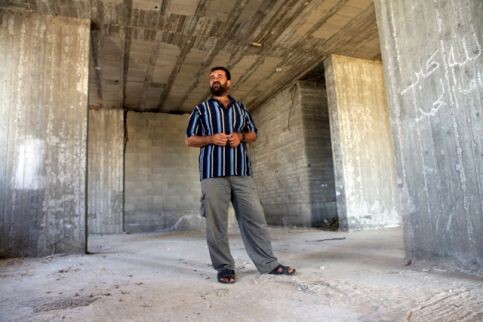 Bassam Dardouna stands in the abandoned apartment that he and his family are living in. (Anne Paq/Activestills.org)