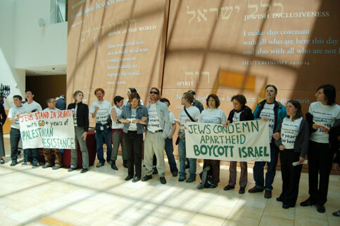 Anti-Zionist Jews disrupt the “Israel at 60” symposium inside the San Francisco Jewish Community Center. (M.)