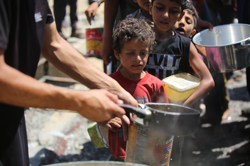 Children at a charity kitchen in Nuseirat await food rations on 13 July 2025.