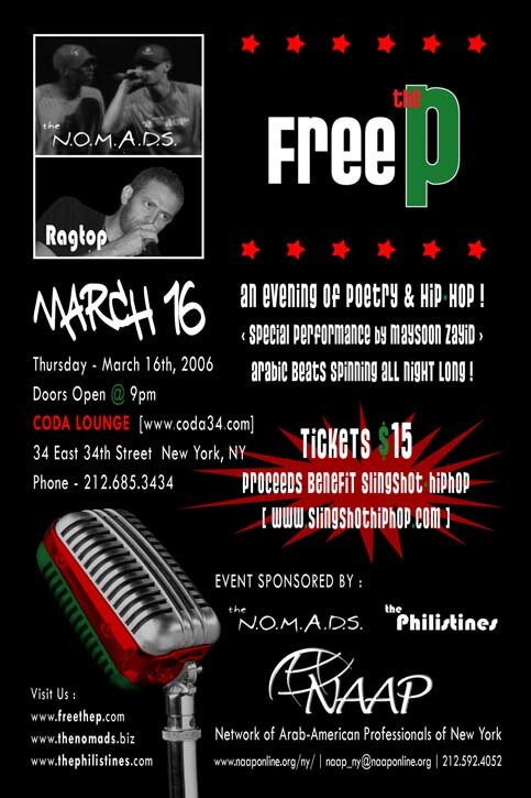 Proceeds will benefit NAAP-NY community initiatives and Slingshot Hip-Hop, a documentary film that focuses on the daily life of Palestinian rappers living in Gaza, the West Bank and inside Israel. It aims to spotlight alternative voices of resistance within the Palestinian struggle and explore the role their music plays within their social, political and personal lives.