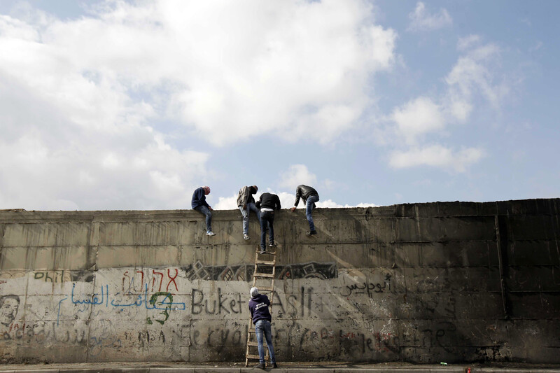 Palestinians climb a ladder to get over the Israeli-built wall separating the occupied West Bank village of Abu Dis from Jerusalem, 17 November 2014.