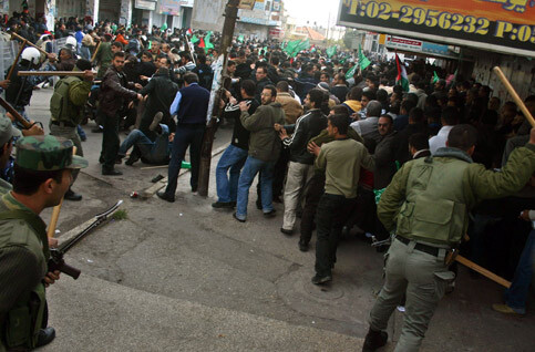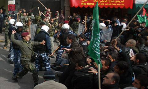 Above: Palestinian security forces clash with Hamas demonstrators after the Friday prayers in the West Bank city of Ramallah, 15 December 2006. At least thirty Palestinians were injured as supporters from Fatah and Hamas clashed following an attempted assassination of Prime Minister Ismail Haniyeh as he returned to Gaza yesterday. (Photo: MaanImages/Fadi Arouri)