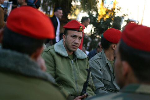 December 14th: Palestinian security officers attend a Fatah demonstration in the West Bank city of Ramallah following the killing of three sons of a Palestinian intelligence chief loyal to Abbas in Gaza City on Monday. (Photo: MaanImages/Fadi Arouri)