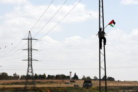 A demonstrator hangs a Palestinian flag from an electrical tower on Land Day in Gaza, 30 March 2010. (Wissam Nassar/MaanImages)