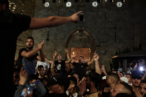 Relatives of Palestinians killed by Israeli forces participate in a mass iftar (Ramadan fast breaking meal) organized by the Lions Den, a recently formed Palestinian armed group, in the West Bank city of Nablus on 16 April.