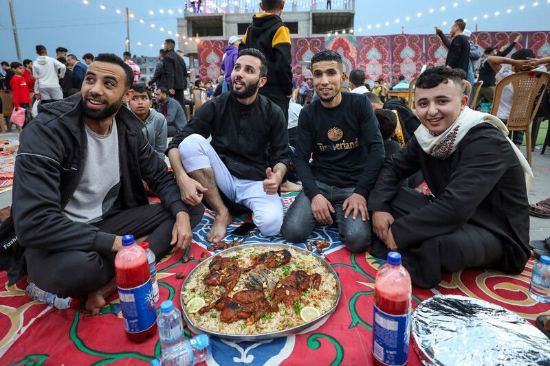 Palestinians break their Ramadan fast with a collective iftar meal in Nuseirat, central Gaza Strip, on 9 April.