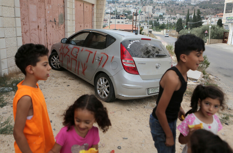 Palestinian children play near a car spray-painted with Hebrew-language graffiti reading “Jews will not be silent” in the West Bank town of Sinjil, north of Ramallah, on 27 August.