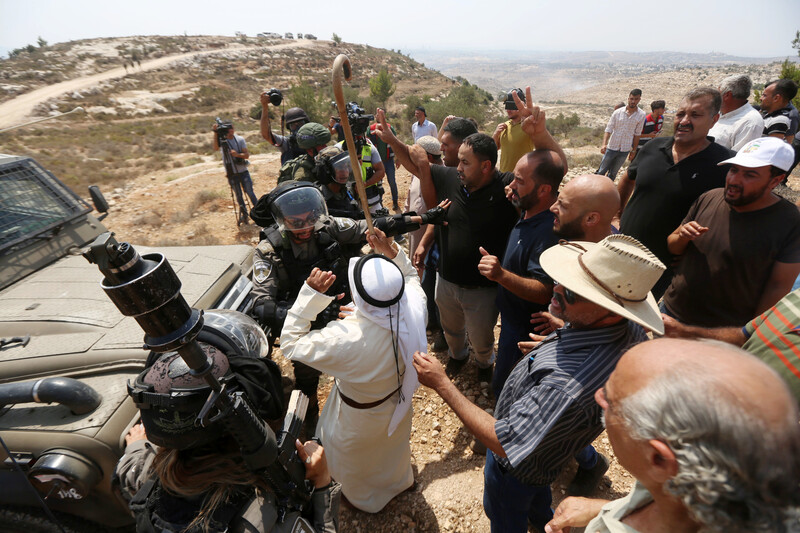 Palestinian protesters scuffle with Israeli paramilitary border police during a protest against Israeli settlement construction in the village of Ras Karkar, near the West Bank city of Ramallah, 31 August.