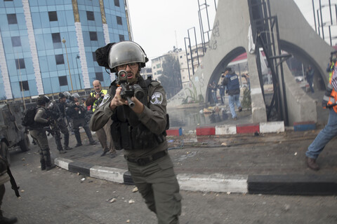 An Israeli Border Police combatant points his weapon at Palestinian medics during confrontations with protesters near the Beit El checkpoint in the central West Bank on 22 December.