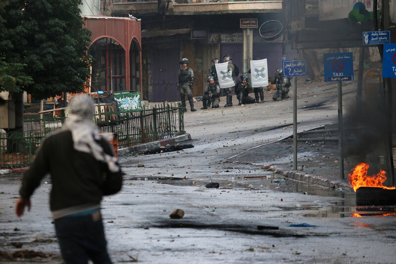 Palestinians confront Israeli occupation soldiers during a mass strike to protest settlement expansion and confiscation of Palestinian property in the West Bank city of Hebron, 12 December.