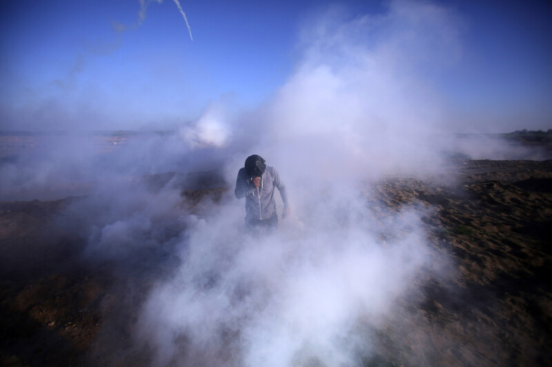 A Palestinian protester is engulfed by tear gas during Great March of Return protests east of Gaza City on 4 January.