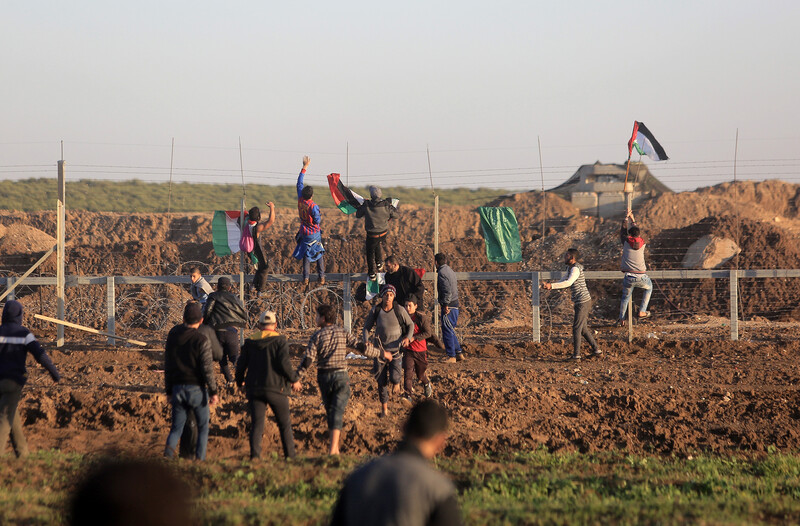 Protesters climb a fence along the Gaza-Israel boundary and hang Palestinian flags on it during Great March of Return protests east of Gaza City on 11 January. The Israeli army fatally injured a woman and a boy during the day’s demonstrations.