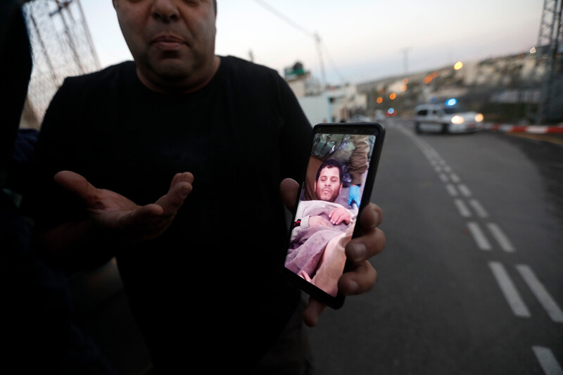 An Israeli settler displays a photo of an injured Palestinian man after the latter was shot in what Israel claimed was an alleged stabbing attack at the entrance of Kiryat Arba settlement in the West Bank city of Hebron on 11 January.