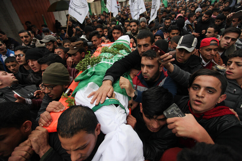 Mourners carry the body of Palestinian Abd al-Raouf Salha, 14, during his funeral in Jabaliya, northern Gaza Strip, on 14 January. The child succumbed to his wounds days after being shot in the head with a tear gas canister during Great March of Return protests.