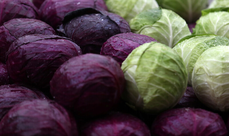 Cabbage is sold at a market during a windy and rainy day in the West Bank city of Nablus, 16 January.