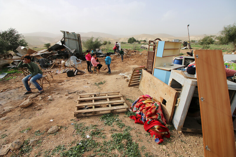 A Palestinian family sits among their belongings after Israeli occupation forces demolished their residential structures in Fasayil al-Wusta, a Bedouin community in the West Bank’s Jordan Valley, 16 January. The structures were demolished on the pretext that they were built without a permit, which are very rarely granted to Palestinians living in the 60 percent of the West Bank under full control of the Israeli military.