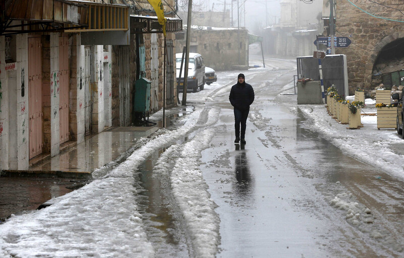 A Palestinian walks down a street near the Old City of Hebron’s Ibrahimi mosque in the West Bank during a winter storm, 17 January.