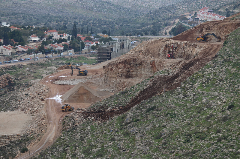 Construction work is seen at the Israeli settlement of Avnei Hefetz, near the West Bank town of Tulkarem, 18 January. All Israeli settlements are illegal under international law, which forbids an occupying power such as Israel from transferring its civilian population to the territory it occupies.