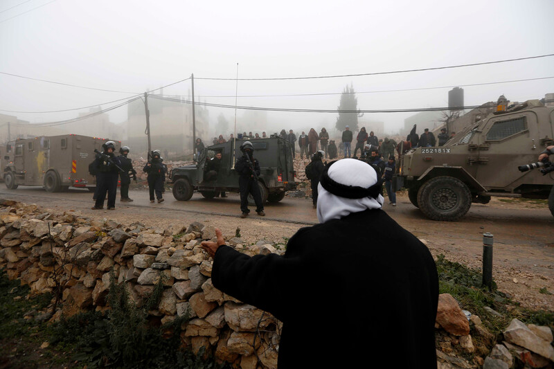 A Palestinian man speaks to Israeli occupation forces in front of the home of a teen accused of stabbing and killing an American settler in the West Bank last September, after the home was partially demolished by Israeli soldiers in the village of Yatta, southern West Bank, 18 January.