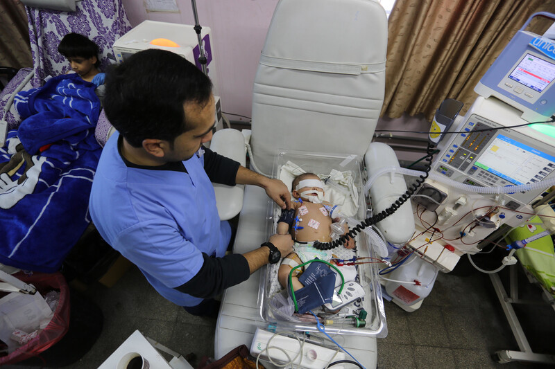 A Palestinian baby receives medical care at al-Rantisi hospital in Gaza City on 19 January. Gaza’s health ministry warned that health services would be interrupted due to depletion of fuel stocks used to power hospital generators during Gaza’s regular power outages.
