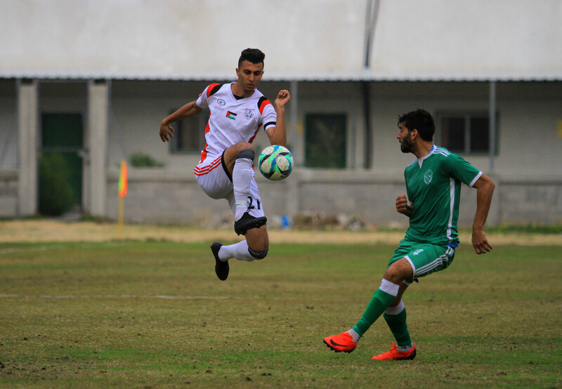 Etihad al-Shujaiya team (green uniform) and Shabab Khan Younis compete at Gaza City’s Palestine Stadium on 20 January.